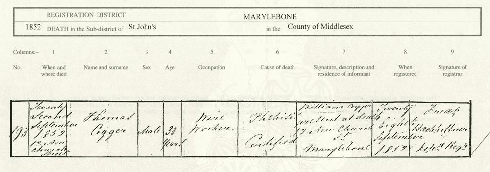 died 1852 age 33 occupation wireworker | Mentioned in Sarah COGGER's Will | ||