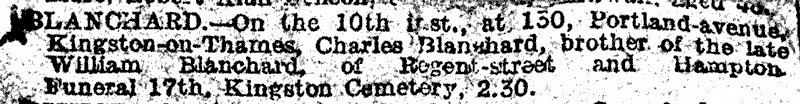 Newspaper cutting of funeral of Charles BLANCHARD linking him to his brother William BLANCHARD of Hampton and Regents Street |